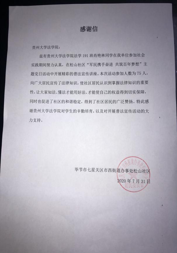 本次暑期社会实践活动取得了良好的社会效果,一批批法学学子正在通过不同的方式服务社会,真正践行了永利3044浏览器“明德至善 博学笃行”的校训。同学们在实践活动中不断强化专业技能,顺应时代发展需求,积极助力推进全面依法治国,实现一个法律人的使命,依靠自身的一言一行投身于疫情防控和法治脱贫的战场,共迎全面小康年。